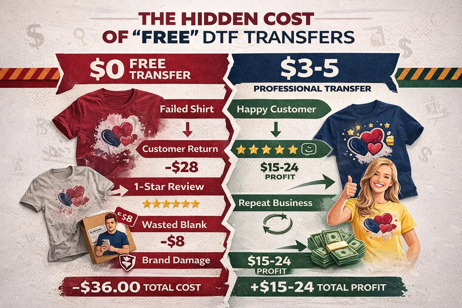 But here’s what we’ve learned from customers who came to us after using promotional transfers: free rarely means quality. And when you’re building a brand, poor quality doesn’t just cost you money—it costs you customers, reviews, and reputation.