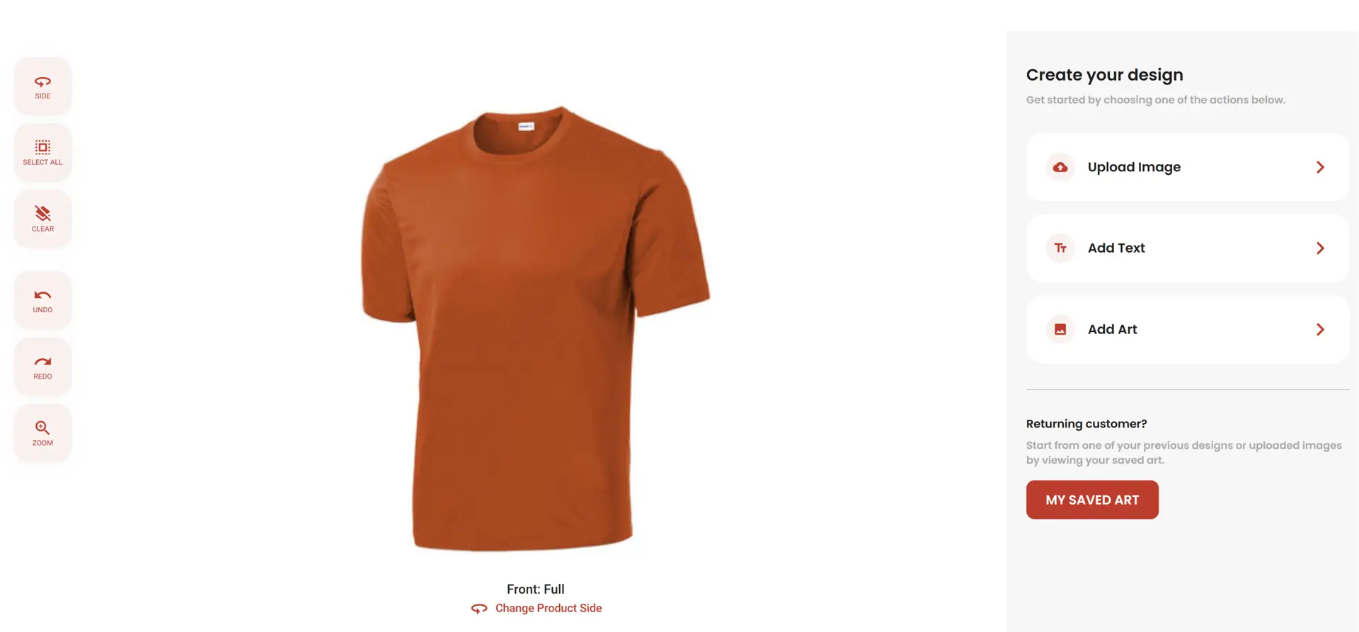 Preview Different Sides: Click “Change Product Side” to switch between Front, Back, Sleeves