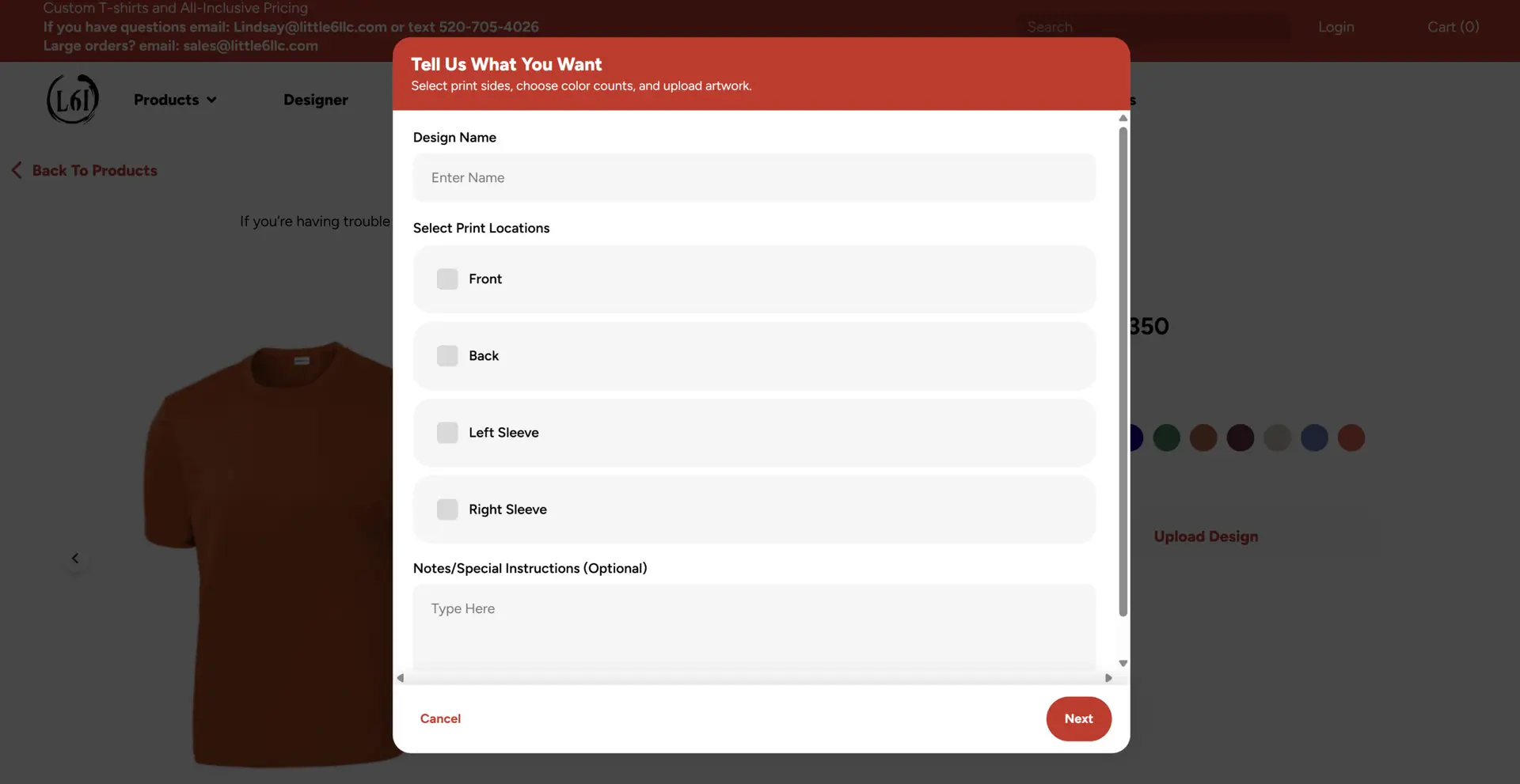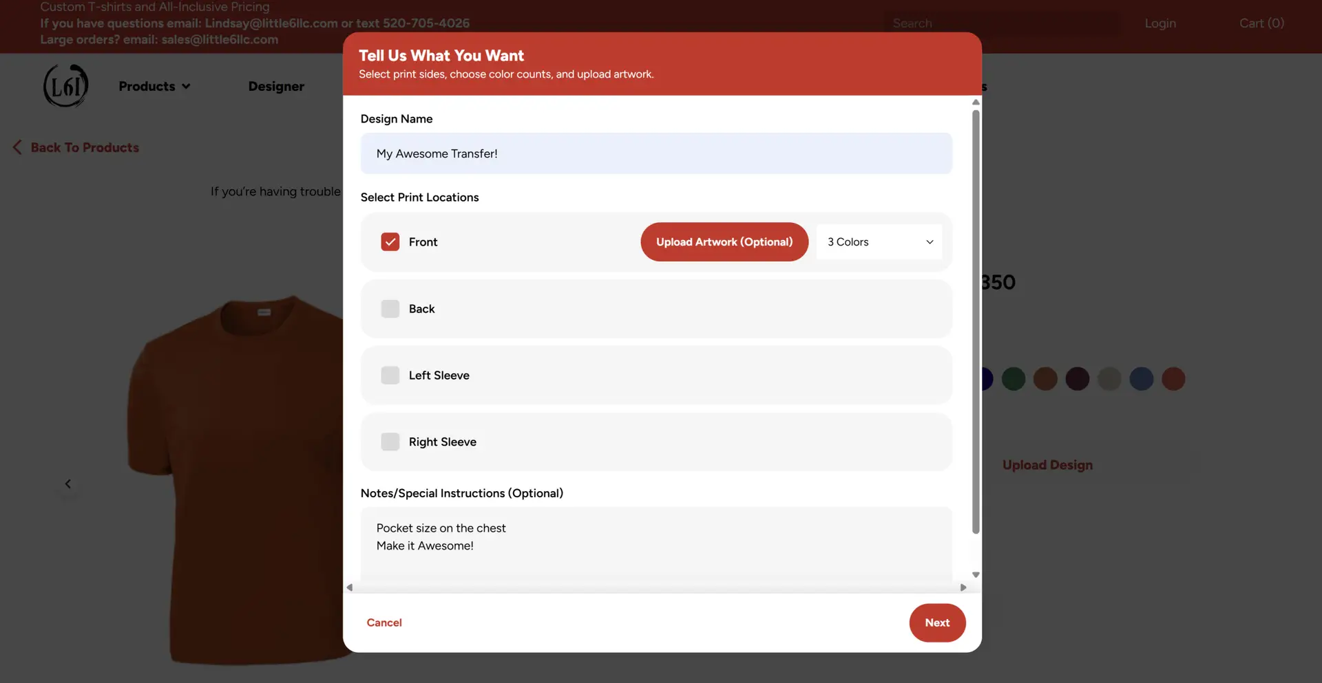 Once you have selected your print locations and either uploaded artwork OR noted we have it on file, click the red “Next” button at the bottom right of the popup.